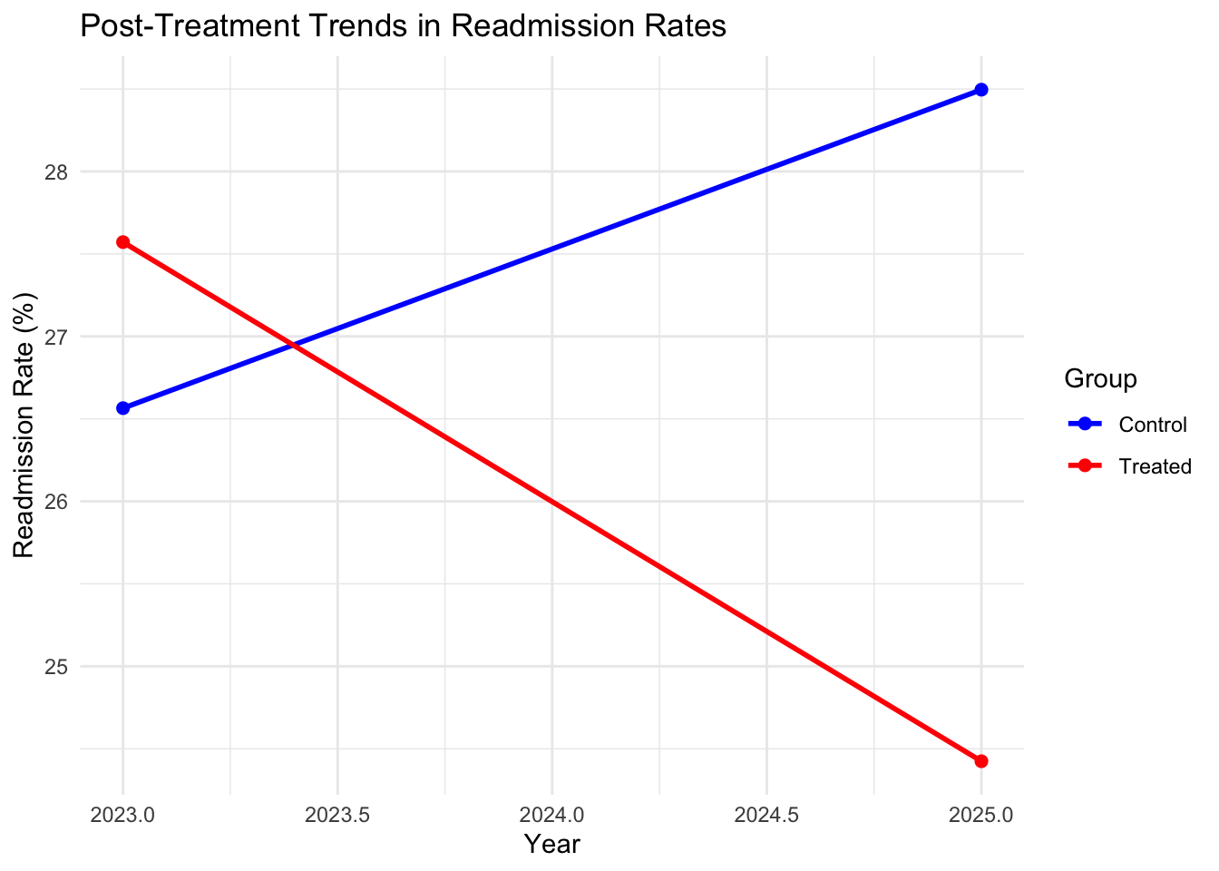 ggplot(means_post, aes(x = year, y = readmission, color = factor(treated), group = treated)) +