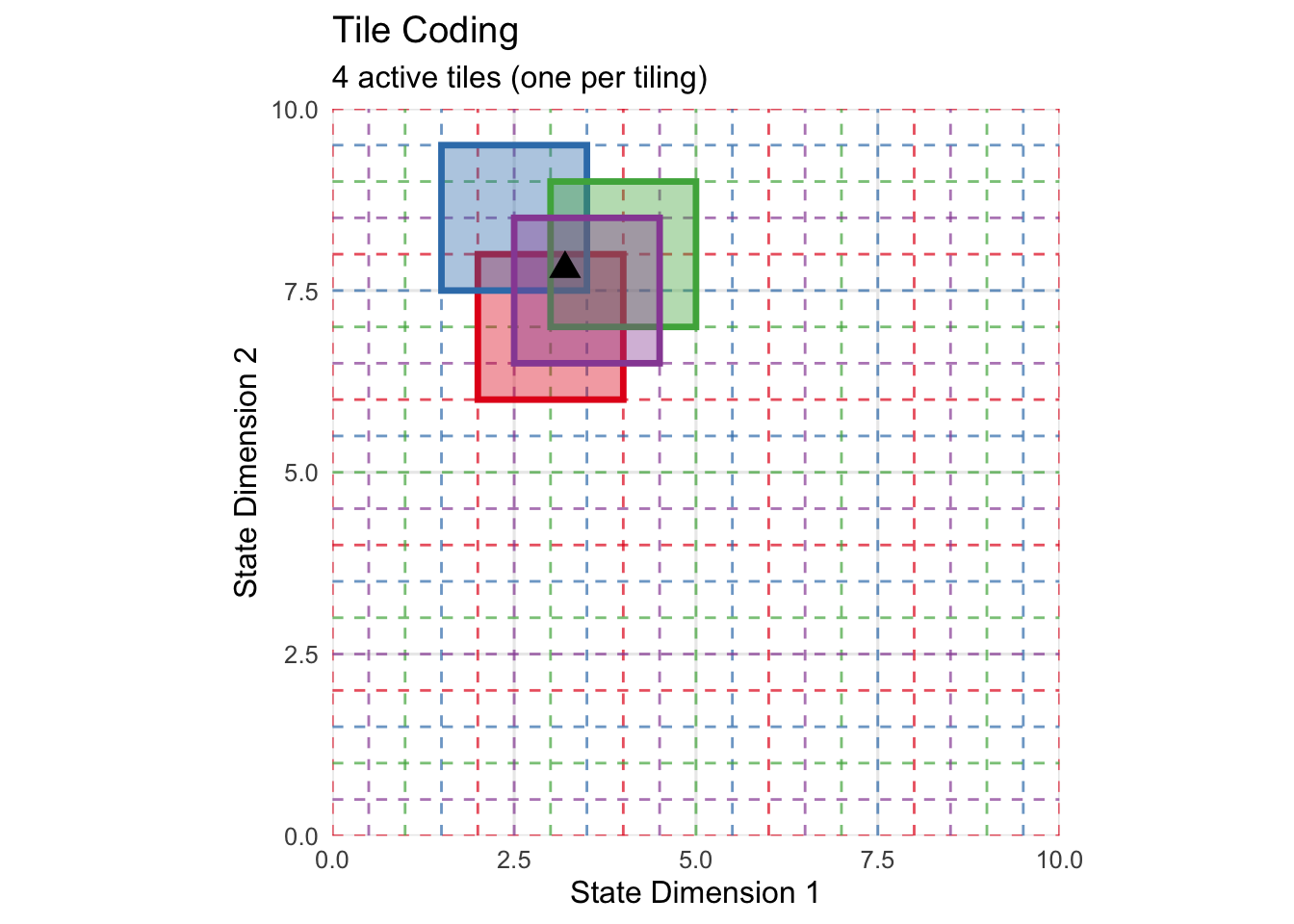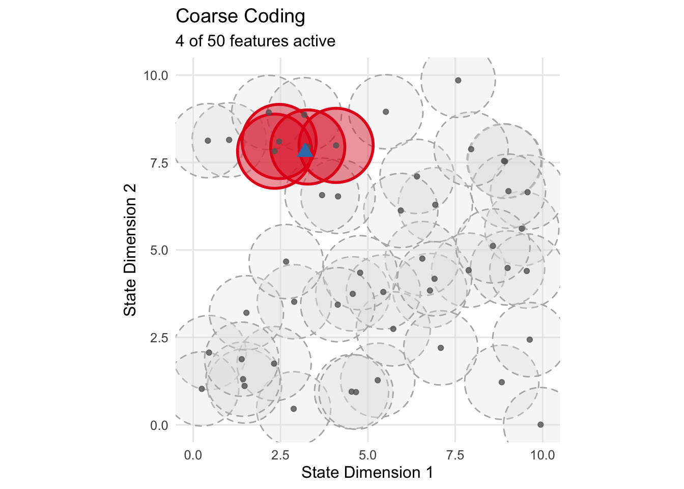 Coarse coding represents the state space using overlapping binary features, where each feature corresponds to a region or “receptive field.” A feature activates when the state falls within its designated region and remains inactive otherwise. The power of this approach lies in the overlapping structure—nearby states activate similar sets of features, creating natural generalization.