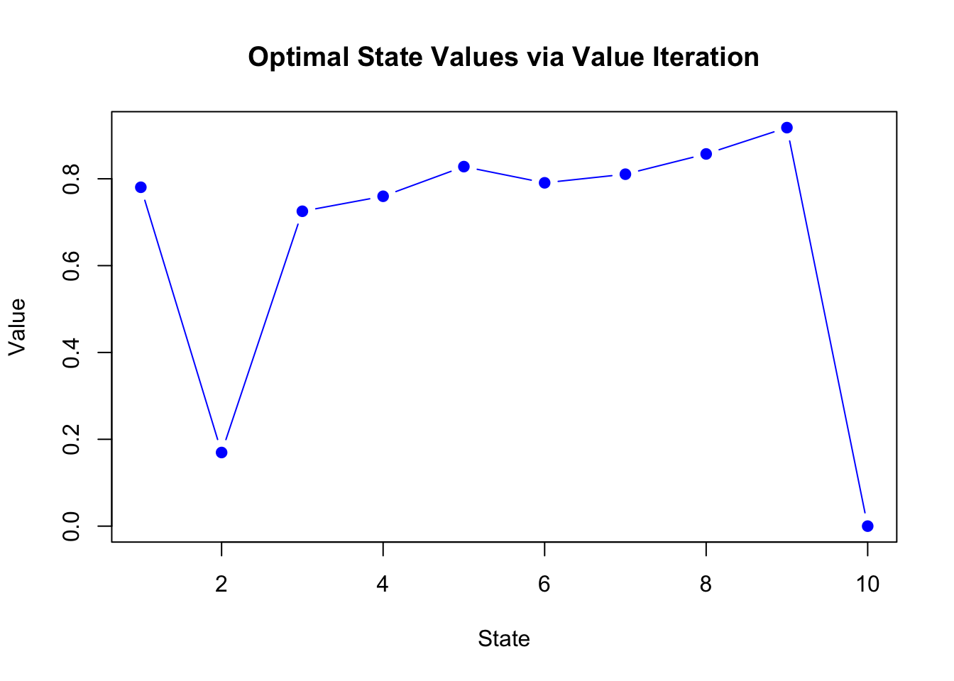 Markov Decision Processes (MDPs) constitute a formal framework for modeling sequential decision-making under uncertainty. Widely applied in operations research, control theory, economics, and artificial intelligence, MDPs encapsulate the dynamics of environments where outcomes are partly stochastic and partly under an agent’s control. At their core, MDPs unify probabilistic transitions, state-contingent rewards, and long-term optimization goals. This post explores MDPs from a computational standpoint, emphasizing Dynamic Programming (DP) methods—particularly Value Iteration—for solving them when the model is fully known. We proceed by defining the mathematical components of MDPs, implementing them in R, and illustrating policy derivation using value iteration. A comparative summary of key aspects of DP methods concludes the post.