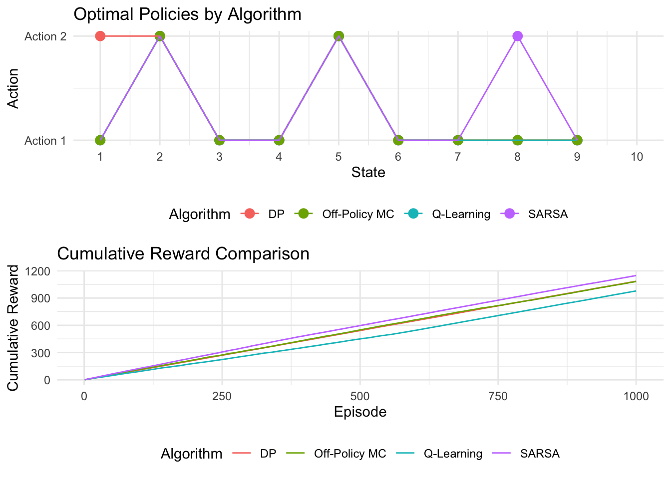 This code runs dynamic programming, SARSA, Q-Learning, and off-policy Monte Carlo under shared hyperparameters, then compares their learned policies and cumulative rewards using ggplot2. The policy plot reveals how closely each model-free method approximates the DP optimal policy, while the cumulative reward plot and average return provide quantitative performance summaries over training episodes.