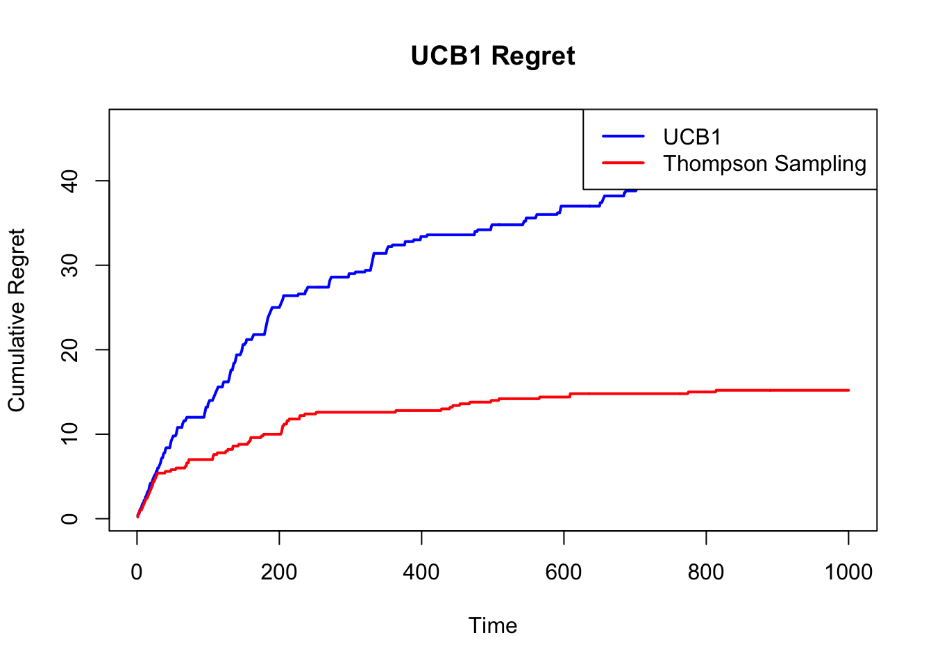 legend("topright", legend = c("UCB1", "Thompson Sampling"),
