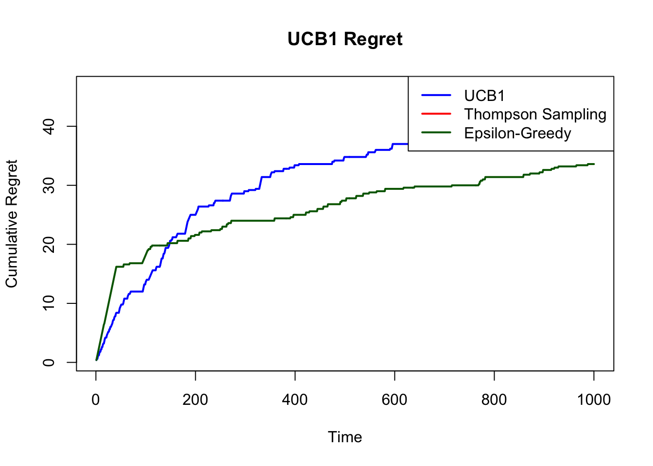 legend("topright", legend = c("UCB1", "Thompson Sampling", "Epsilon-Greedy"),