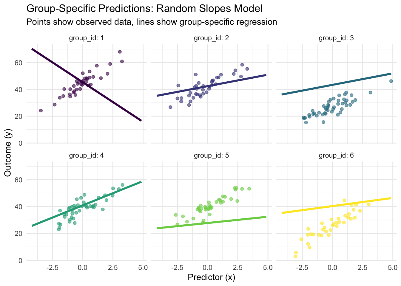 The random intercepts model represents the simplest multilevel structure, allowing each group to have its own baseline level while constraining all groups to have the same slope. This model is particularly useful when we believe the effect of our predictor is consistent across groups, but groups differ in their baseline outcomes.