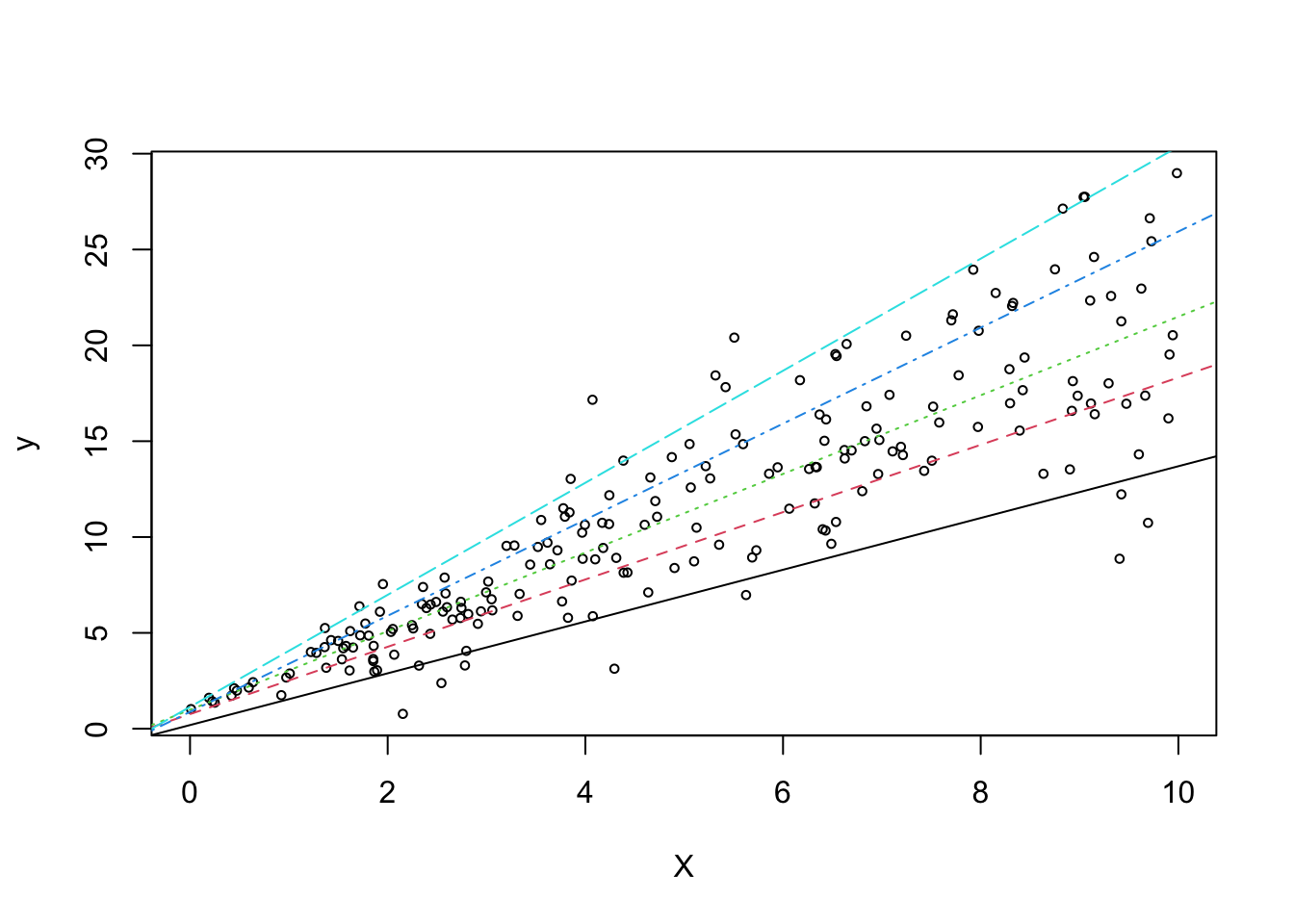 y <- 1 + 2 * x + rnorm(n = n, mean = 0, sd = 0.6*x)