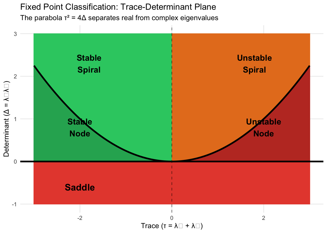 title = "Fixed Point Classification: Trace-Determinant Plane",