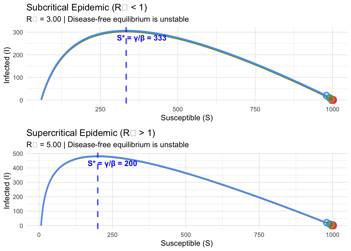 grid.arrange(p1, p2, ncol = 1)## Warning in geom_point(aes(x = params$N, y = 0), color = ifelse(R0 < 1, "#27ae60", : All aesthetics have length 1, but the data has 1503 rows.