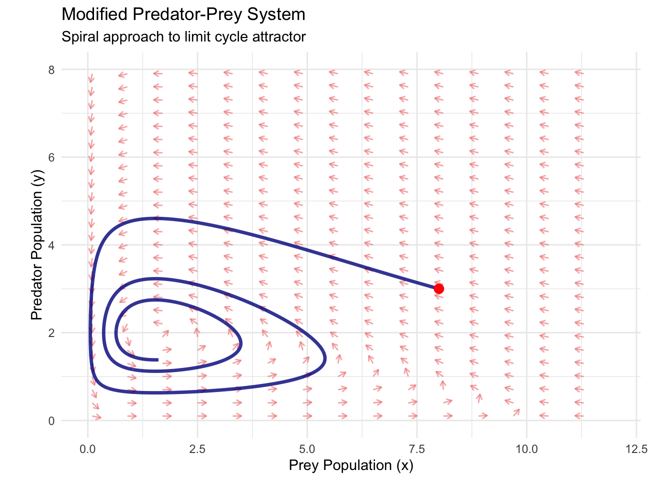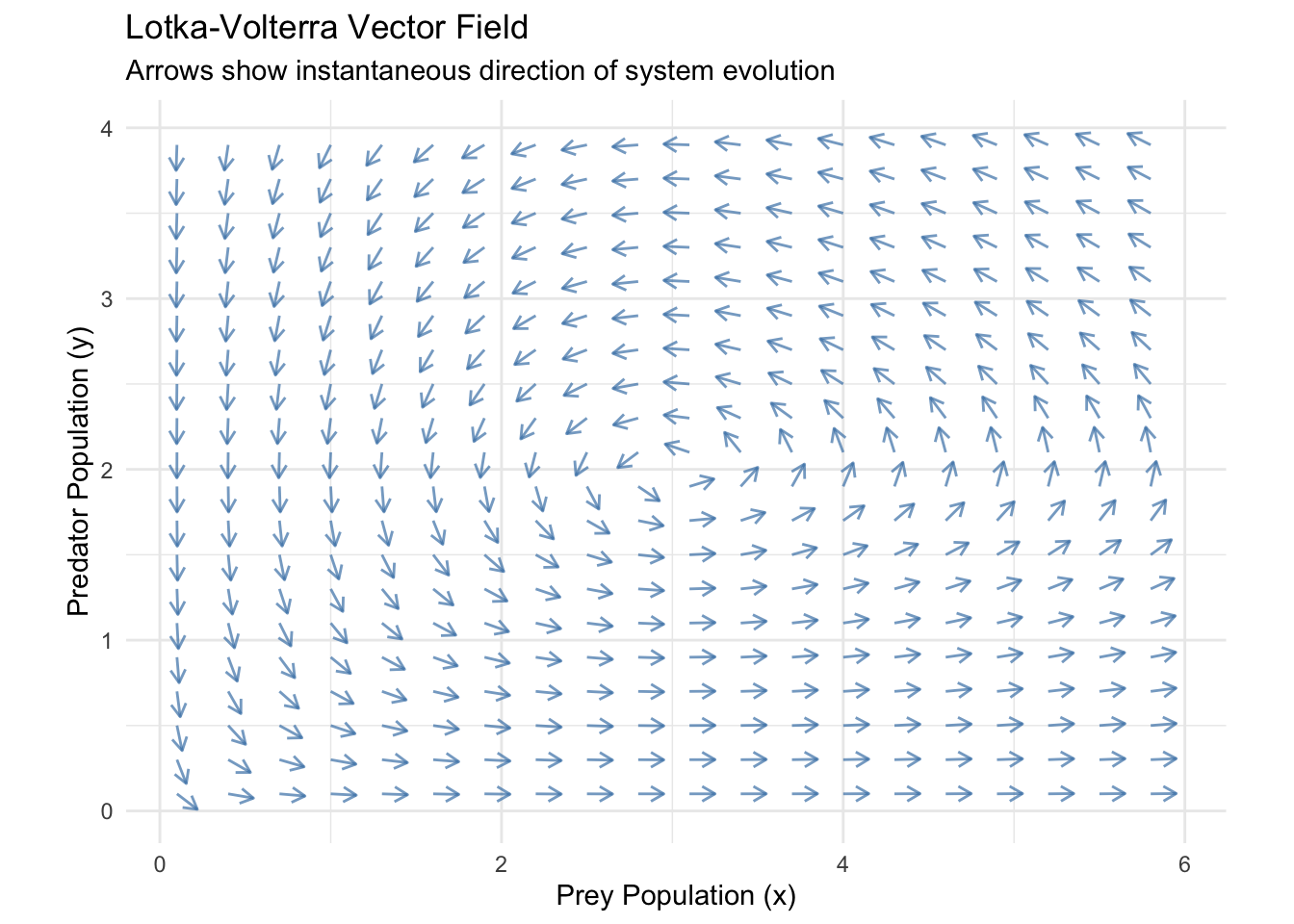 The vector field visualization reveals the geometric structure underlying predator-prey dynamics. At each point in the phase plane, the arrow indicates where a system starting at that point will initially move. The patterns formed by these arrows encode the system’s global behavioral organization.