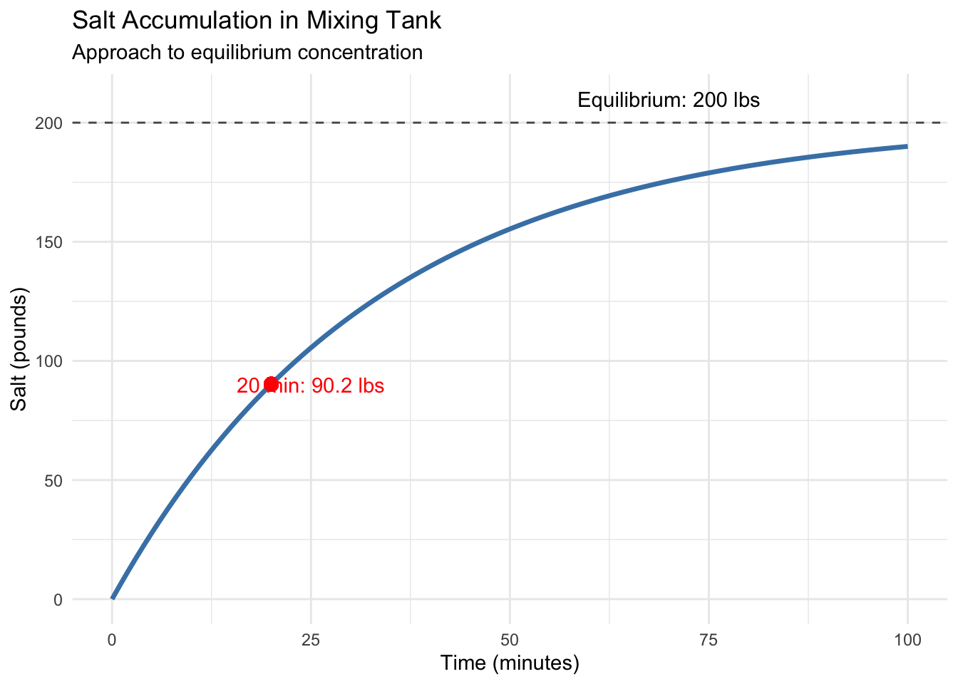 The curve shows salt content rising toward 200 pounds—the equilibrium where inflow and outflow balance. This S-shaped approach to equilibrium appears throughout physics, chemistry, and engineering.