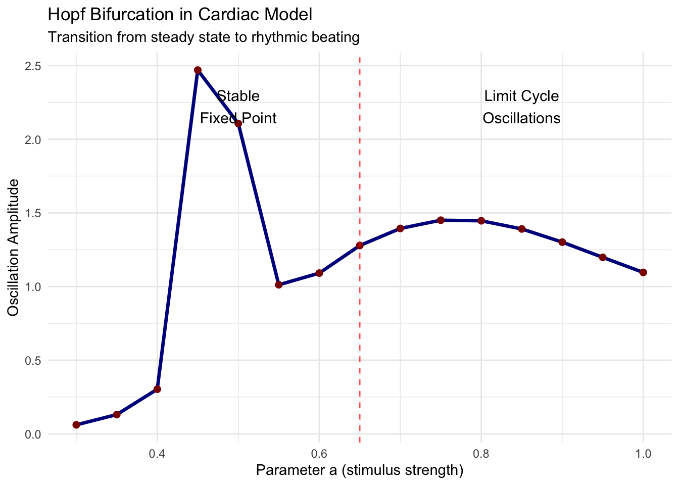 Consider a simplified model of cardiac oscillation using the FitzHugh-Nagumo equations, originally developed to capture neural excitability but equally applicable to cardiac dynamics: