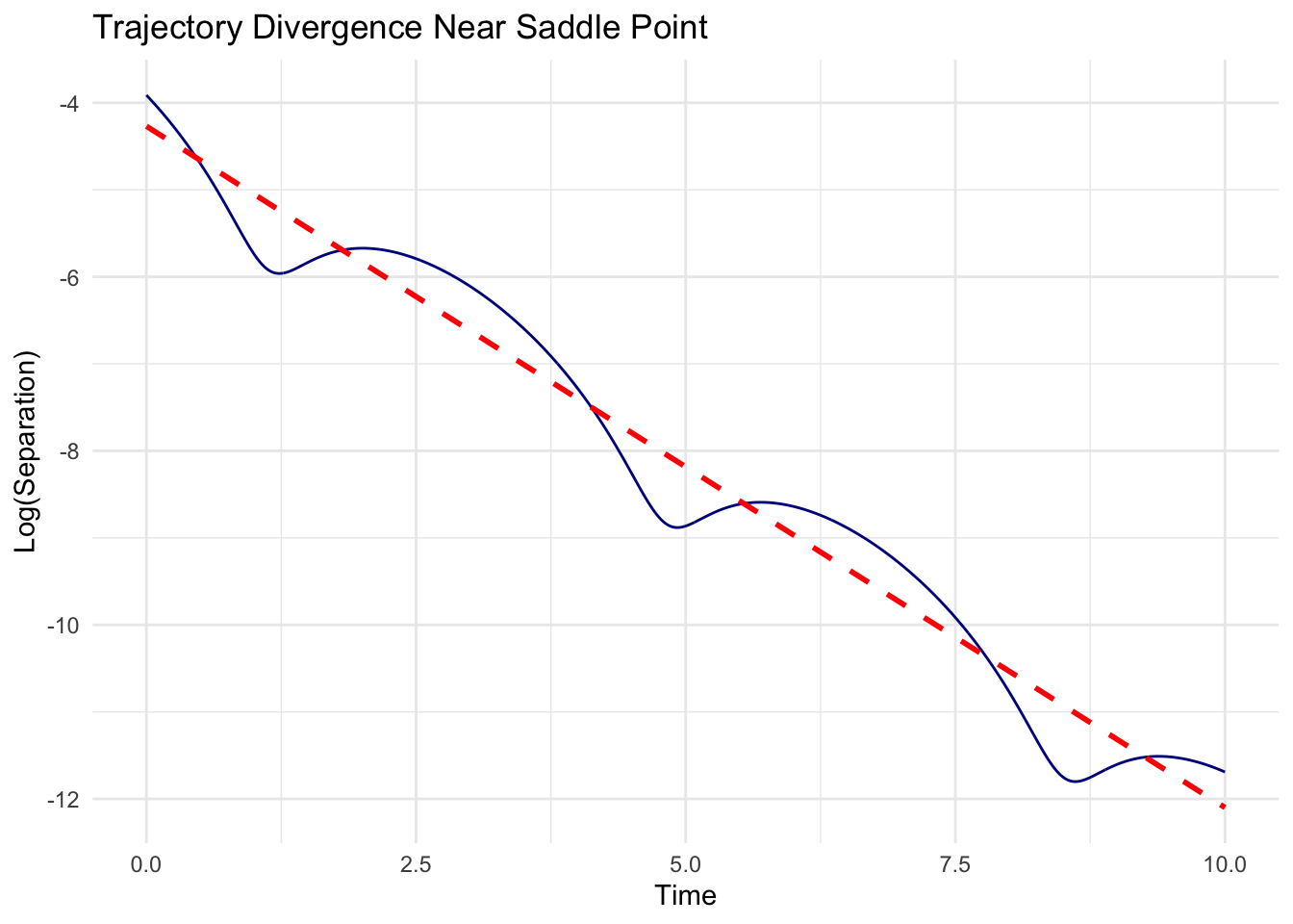 title = "Trajectory Divergence Near Saddle Point",