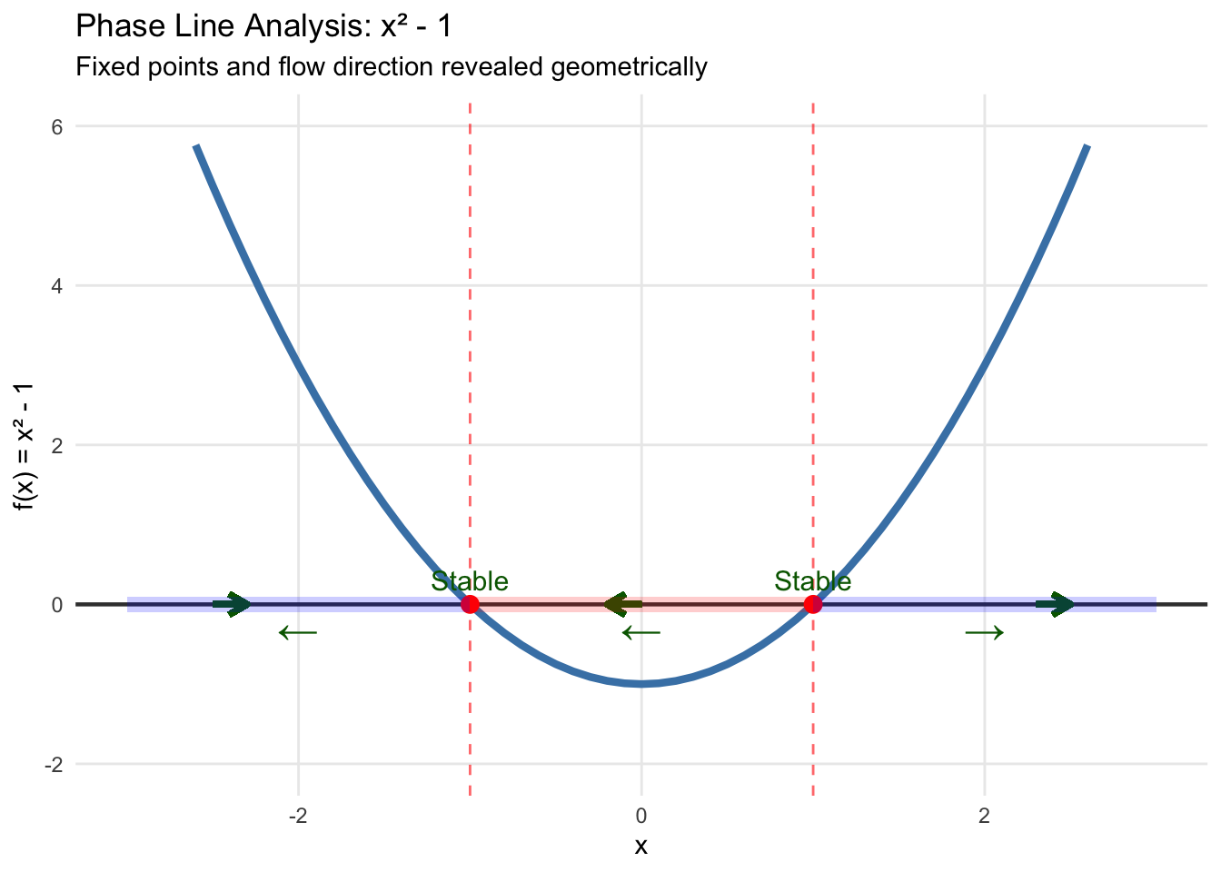 Rather than immediately solving this algebraically, let’s first understand it geometrically. The phase line is constructed by plotting the function \(f(x) = x^2 - 1\) and examining where it crosses the x-axis (our fixed points) and whether it lies above or below the axis (determining flow direction).