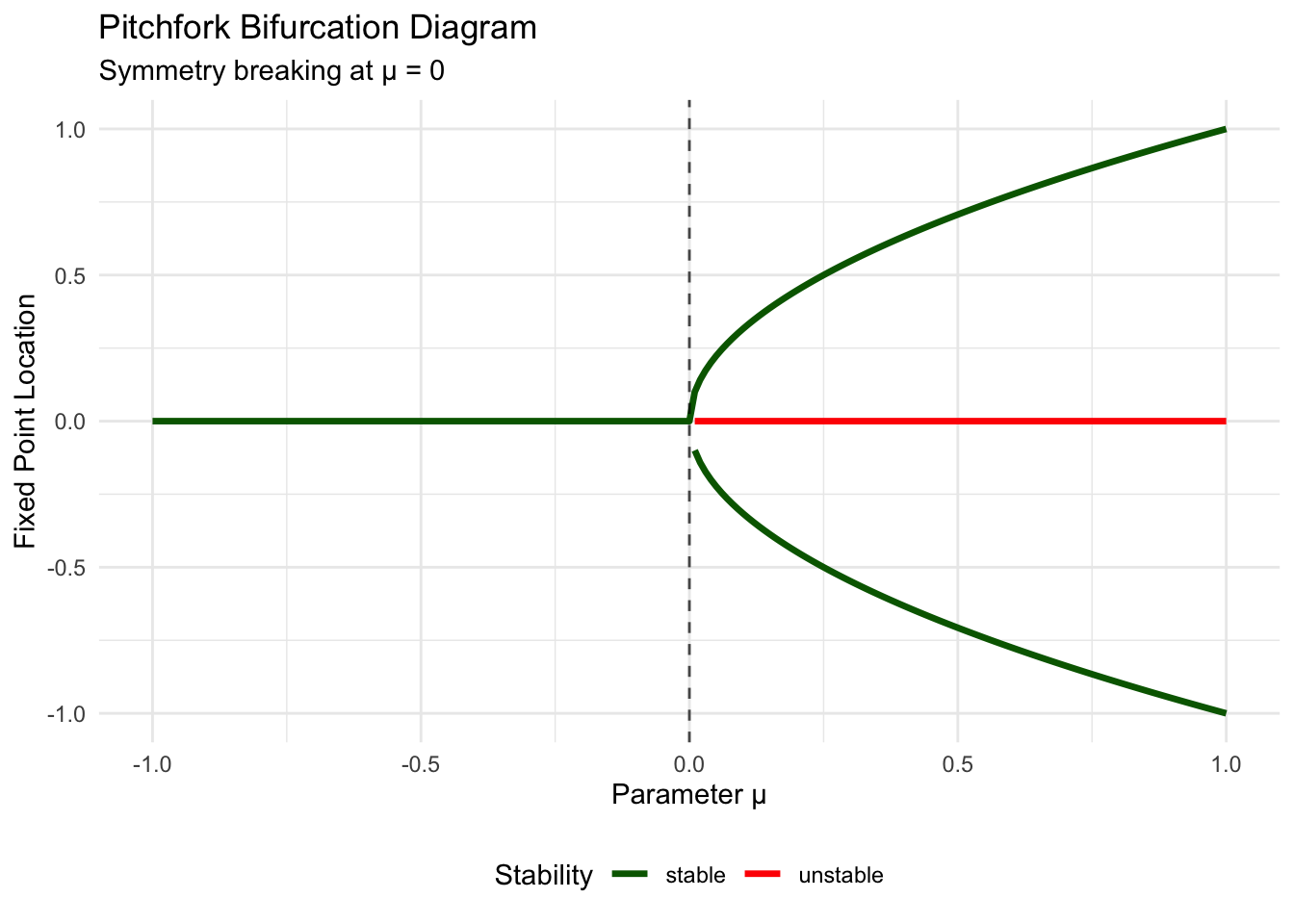 This innocent equation contains a profound story about how fixed points appear and disappear. The parameter \(\mu\) controls the system’s fundamental character.