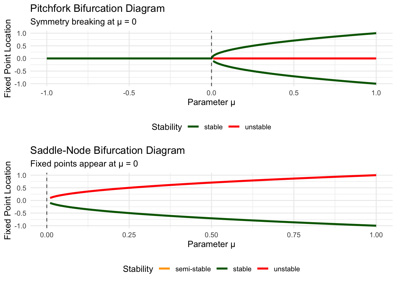 In contrast, saddle-node bifurcations are structurally stable. Small perturbations may shift the bifurcation point but preserve the basic creation/annihilation mechanism. This structural stability explains why saddle-node bifurcations are ubiquitous in applications, while perfect pitchfork bifurcations are rare in real systems.