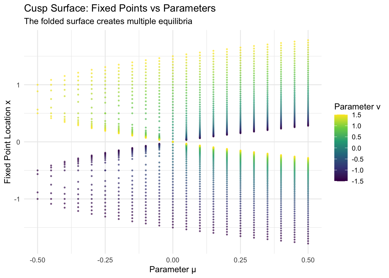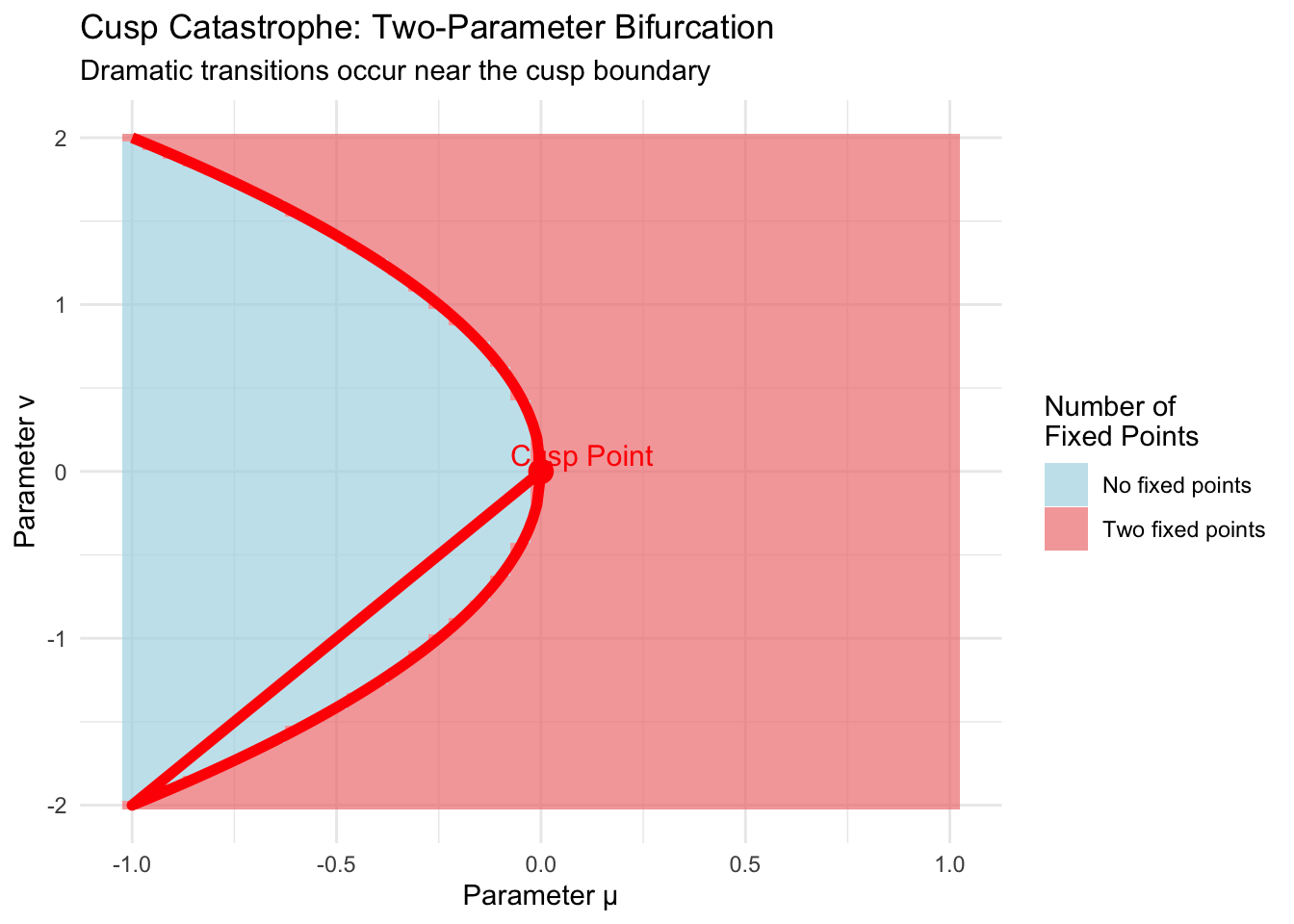The cusp catastrophe reveals how two-parameter systems can exhibit sudden jumps between different stable states as parameters vary continuously. Inside the cusp region (where \(\nu^2 + 4\mu < 0\)), no equilibria exist. Outside the cusp, two equilibria coexist, creating potential for hysteresis and sudden transitions.